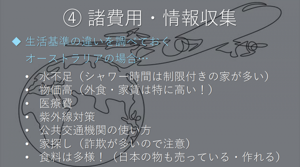 出発前の準備や情報収集、現地到着後の生活や、家・仕事探しのこと、参加者に向けたアドバイスなど、