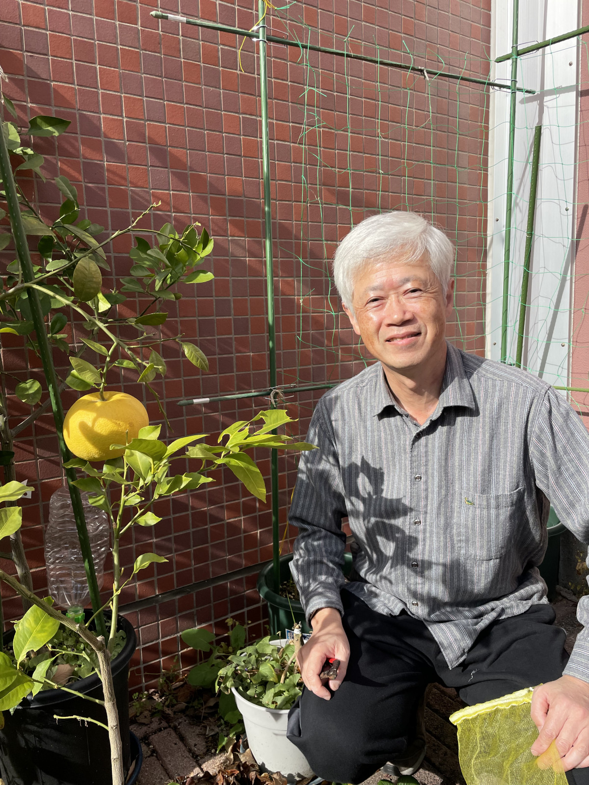 保育学科の宮下裕一教授は、子育てだけでなく植物を育てることも上手です。松江キャンパスの中ほど、建物のかたわらに宮下先生が育てる鉢植えの植物がさりげなく並んでいます。いつぞやは、そこにパイナップルの実がひとつできていて、周囲を行き交う学生たちの目を驚かせたことも。そしてこのたびは、柑橘系の大きな実がふたつ!