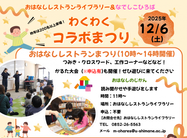 「おはなしレストランライブラリー&なでしこひろば わくわくコラボまつり」を12月6日(土)に開催します