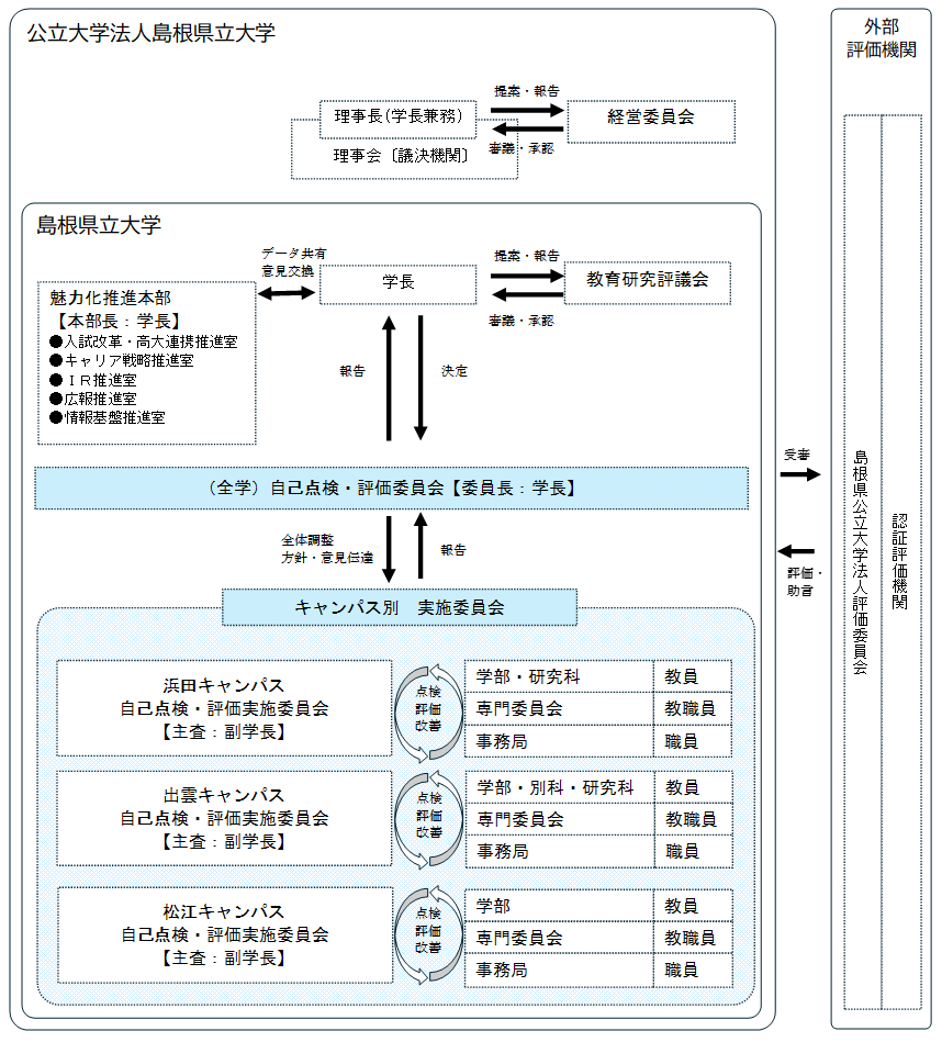 (1)本学における内部質保証の推進に責任を負う組織は、学長を委員長とする自己点検・評価委員会(以下「委員会」という。)とし、島根県立大学自己点検・評価委員会規程第3条第1項に規定する事項を審議する。(2)自己点検・評価の推進を担う主体は、自己点検・評価委員会規程第8条に基づく自己点検・評価実施委員会(以下「実施委員会」という。)とする。実施委員会は、キャンパス担当の副学長を主査としてキャンパス単位で運営するものとし、学部、別科、研究科、指定委員会及び事務局の各組織(以下「学内組織」という。)における自己点検・評価及び教育研究活動等の改善・向上が円滑に行われるよう、調整や支援を行う。